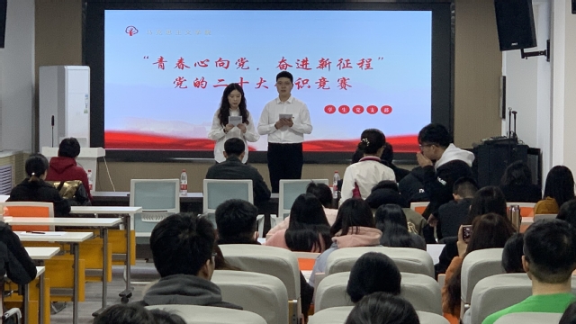为深入推进党的“二十大精神”学习教育,认真贯彻落实习近平新时代中国特色社会主义思想,从理论中汲取力量、在实践中砥砺前行,3月19日晚8点,BB贝博艾弗森官方网站学生党支部在学院201学术报告厅组织开展“青春心向党、奋进新征程”——党的二十大知识竞赛。学院党委书记邓昌豫、党政办公室主任陈洪军、党政办公室方忆、学生办公室王维以及学生党支部书记邵向威现场观看了比赛。学生党支部全体党员、入党积极分子和团员代表到现场观看比赛。